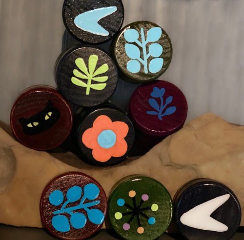 Hand dyed and painted 2 x 1 1/2” (approximately) maple box with aluminum discs inside