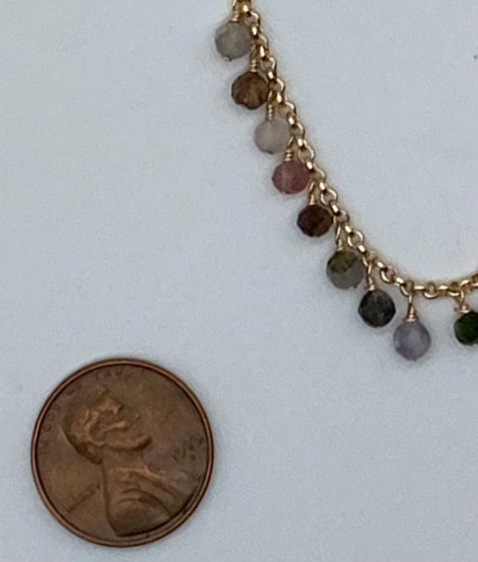 Assorted gemstones dangle from 14k gold filled chain. 16" with 2" extender,