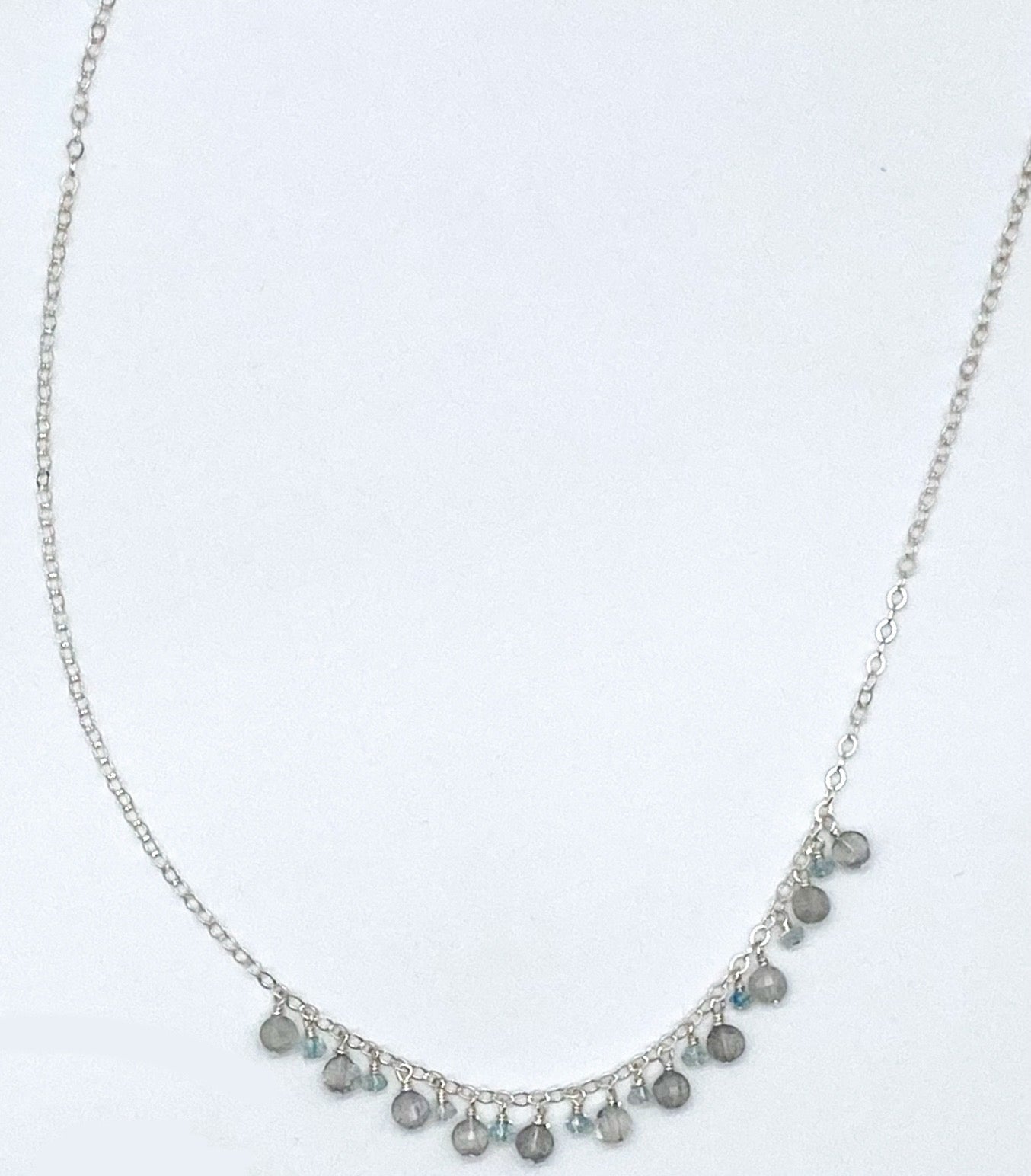 Tiny labradorite coins and sky blue topaz dangle from sterling silver chain. 16" with 2" extender.