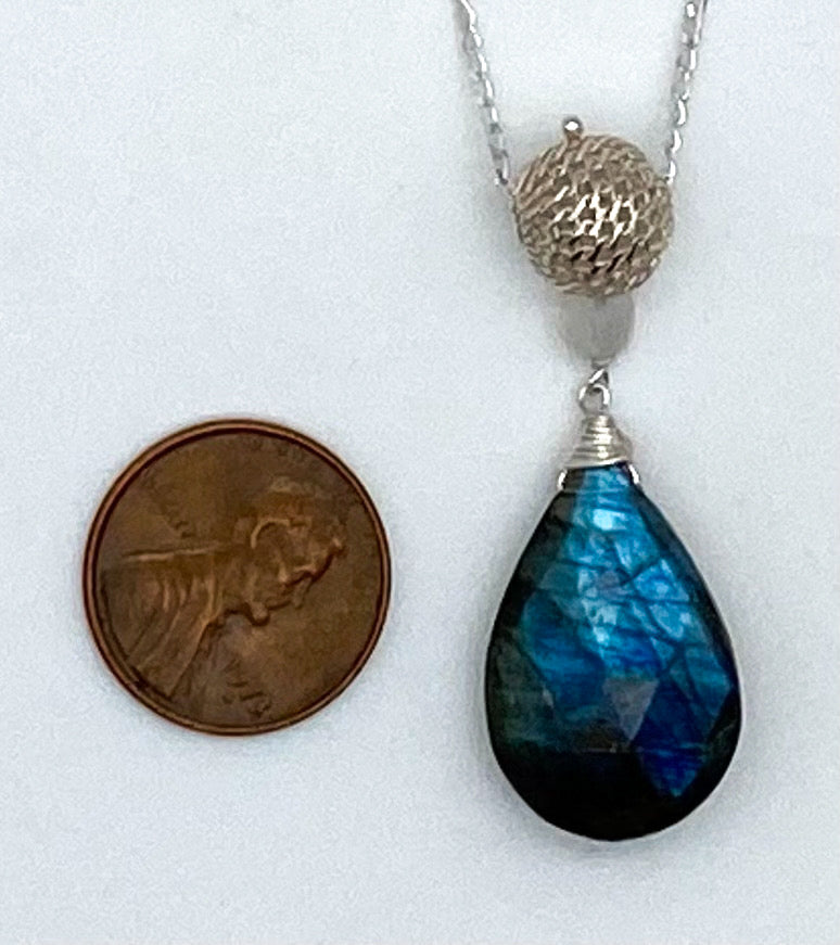Labradorite briolette suspended from sterling silver filigree ball. 16" with 2" extender. Pendant is 1 1/2" long.