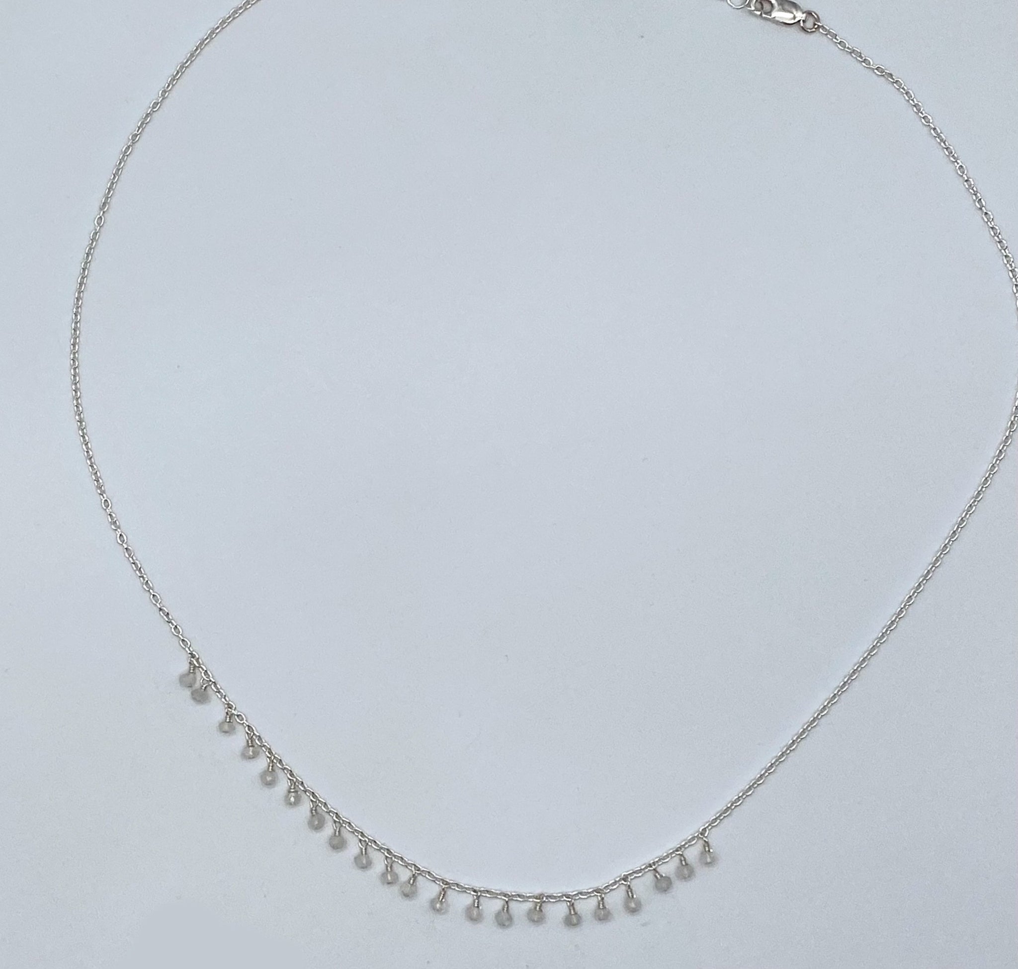 Tiny moonstone coins dangle from sterling silver chain. 16" with 2" extender.
