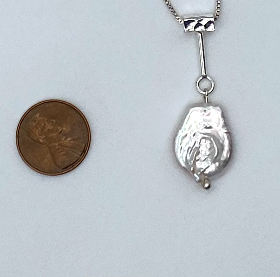 White coin pearl suspended from sterling silver bar. 23" with 2" extender.