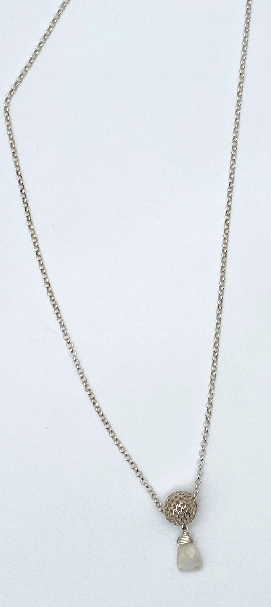 Rainbow moonstone briolette suspended from sterling silver filigree ball. 16" with 2" extender.