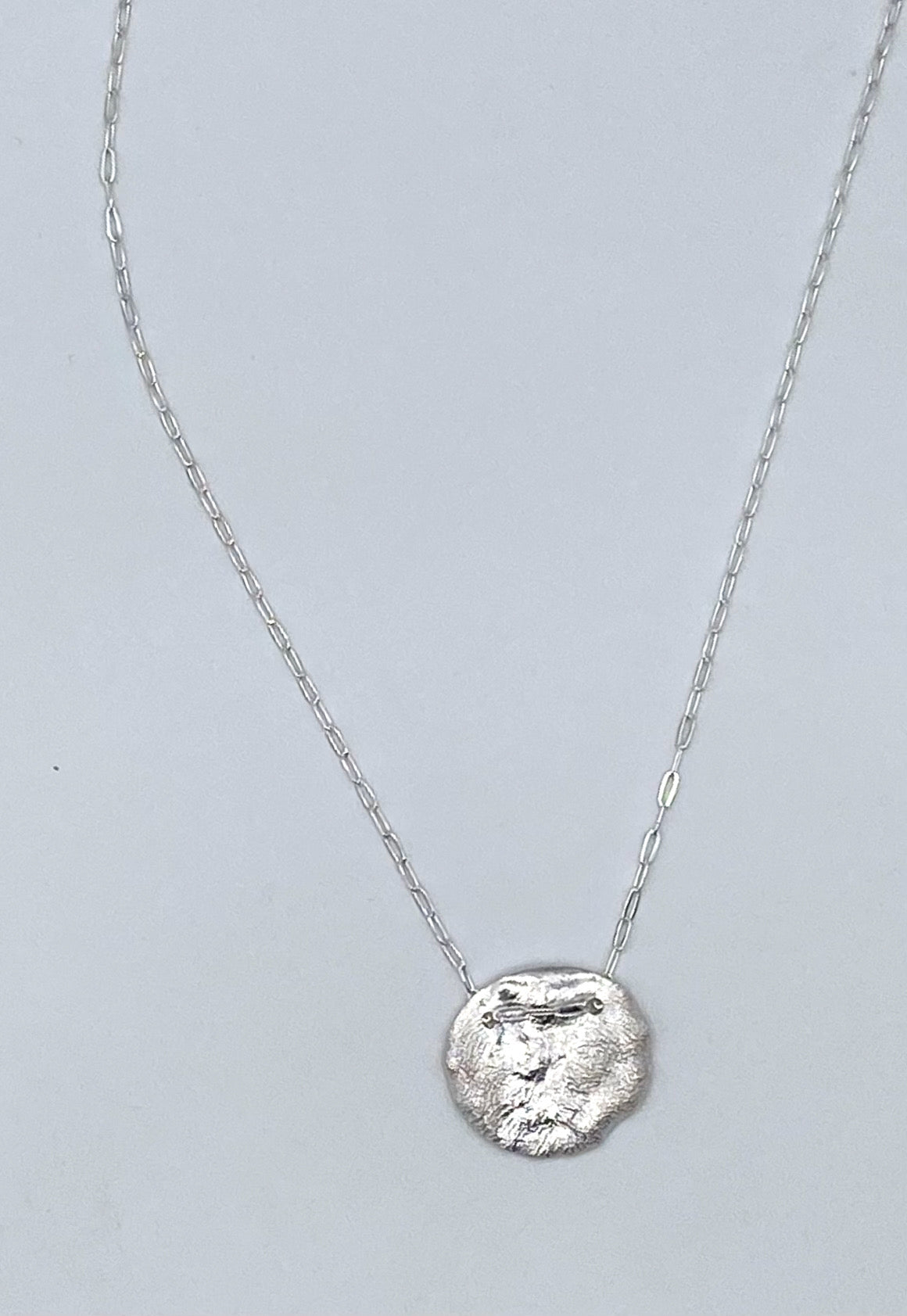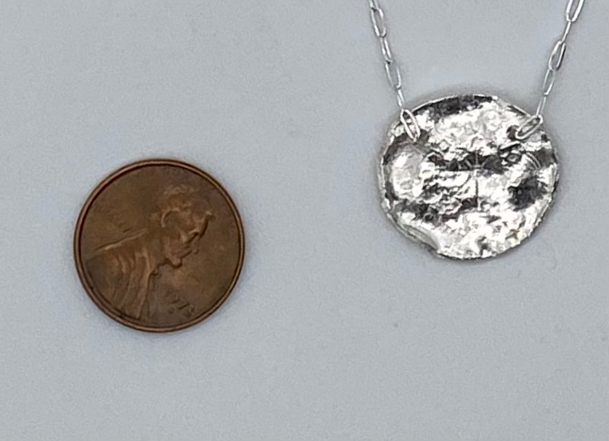 Reticulated sterling silver disc on silver chain. 18" with 2" extender. Disc is 3/4".
