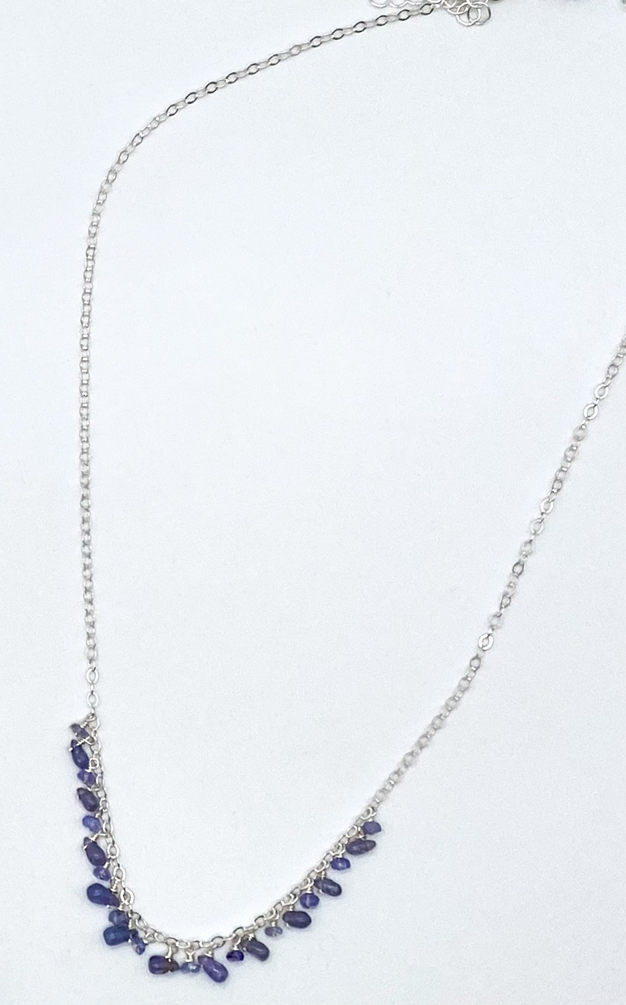 Tanzanite briolettes and rondelles dangle from sterling silver chain. 16" with 2" extender.
